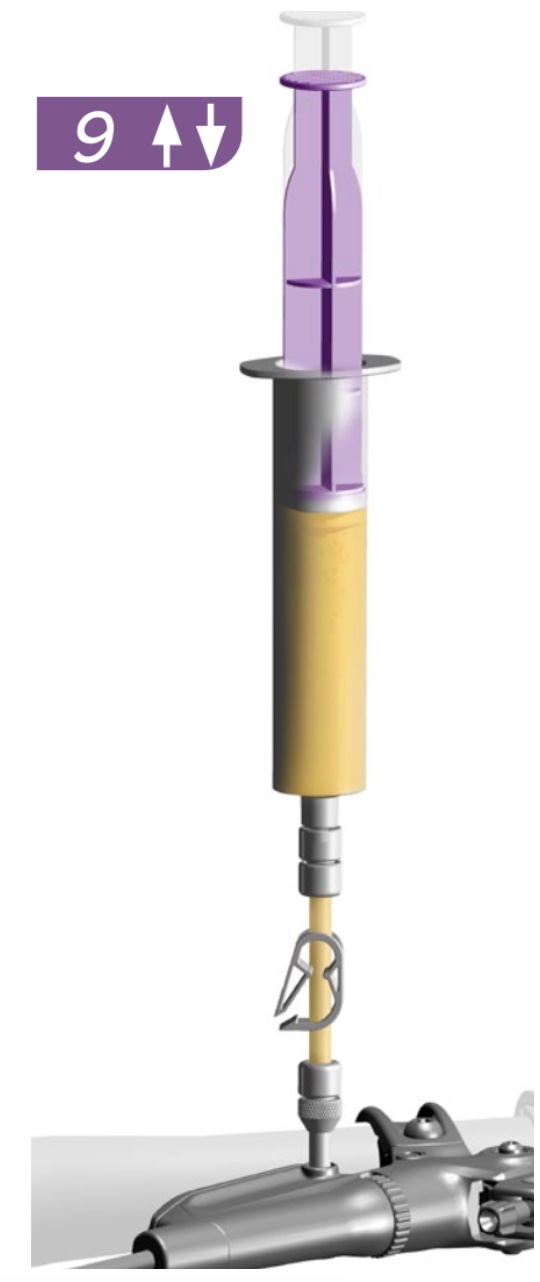 | 14 | Hold the syringe at the lever vertically. Firmly pull on the plunger to create a vacuum, then compress the plunger to pressurize the system. Repeat this process several times or until only a small amount of bubbles exit the system. | ![]() |