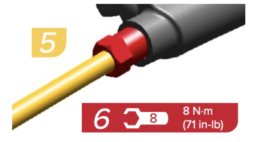 | 7 | Install the hose firmly into the lever body while threading the compression nut by hand (make sure you put SRAM DOT on the nut threads). Use an 8 mm flare nut wrench to tighten the compression nut. | ![]() |
